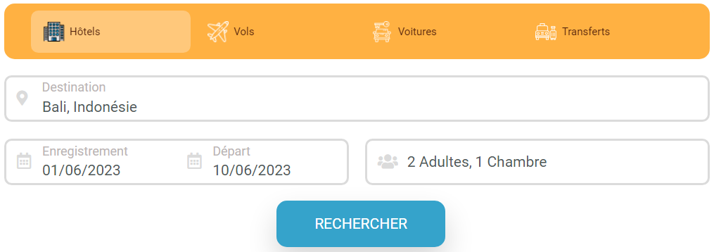 Vous renseignez la destination souhaitée, les dates de votre choix, le nombre de personnes et de chambres, puis lancez votre recherche.