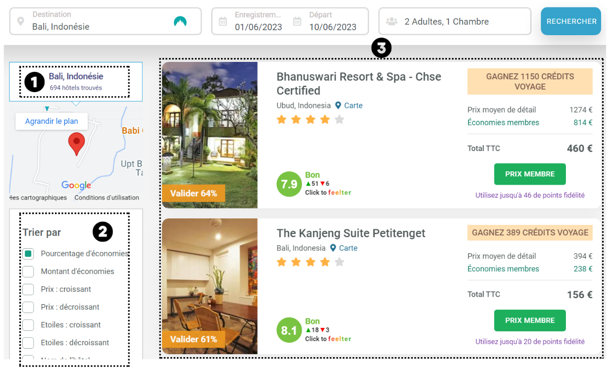 Enfin, nous obtenons la liste des hôtels correspondant à notre recherche. Pour le premier hôtel, comme nous pouvons le constater, nous réalisons 64% d'économie par rapport aux sites publics généralement consultés. Tandis que pour le deuxième hôtel, nous économisons 61%.