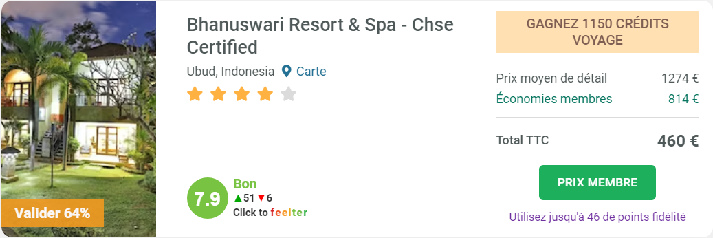 C'est un établissement dont le prix moyen constaté sur Internet et auprès de l'hôtel est de 1 274€ pour les dix jours que nous avons renseignés. Grâce au modèle économique de la plateforme Travel Advantage, expliqué précédemment, qui ne nécessite pas de frais de publicité et applique une faible marge sur ces hôtels, nous pouvons réaliser une économie de 64% sur cet hôtel et économiser 814€. Ainsi, le coût final s'élève à seulement 460€.