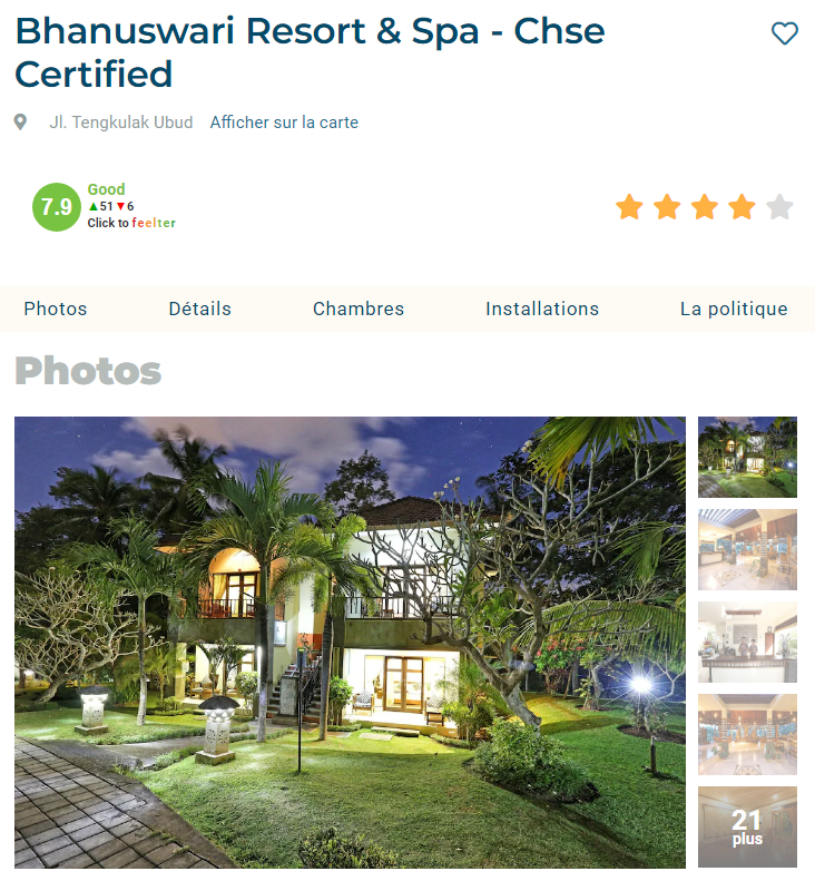 Lorsque vous accédez à la page de l'hôtel, vous trouverez les photos de l'établissement, les détails concernant celui-ci, les différentes chambres et leurs prix, les équipements disponibles, les options de repas ainsi que les points d'intérêt situés à proximité de l'hôtel.